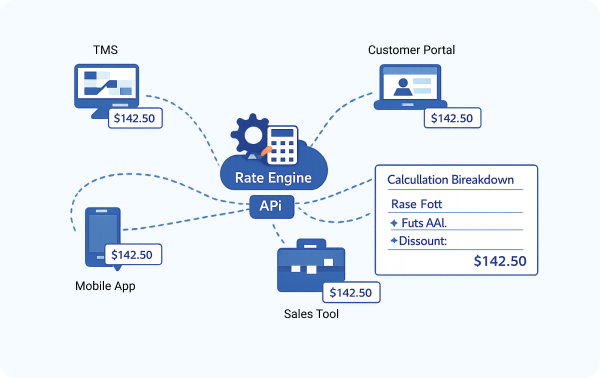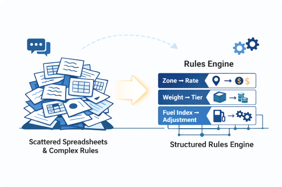 When pricing rules live in spreadsheets, email threads, or separate department systems, quoting becomes slow and inconsistent. Manual updates create errors, margins get distorted, and API integrations return unreliable results. A centralized rate engine eliminates pricing chaos and ensures every quote, booking, and invoice follows the same logic.
